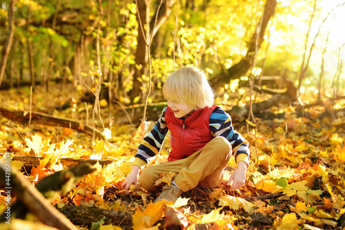 Little boy having fun during stroll in the forest at sunny autumn day. Child playing maple leaves. Active family time on nature. Hiking with little kids.