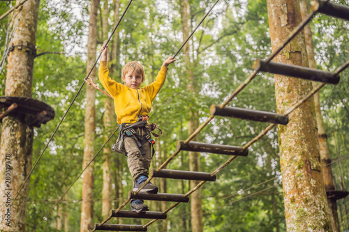 Little boy in a rope park. Active physical recreation of the child in the fresh air in the park. Training for children
