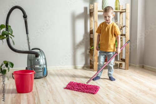Little boy is cleaning the floor of a room using a mop. Concept of independence, help to parents, housework of the child