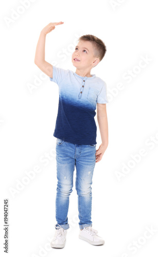 Little boy measuring height on white background