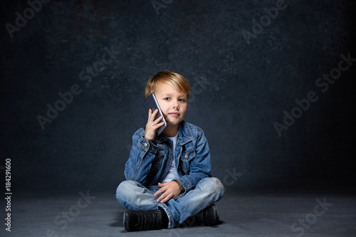 Little boy sitting with smartphone in studio