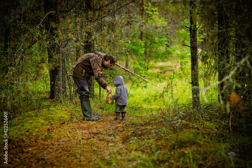 little boy walks through the woods with dad, selective focus