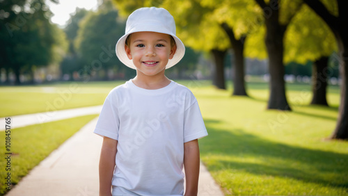 Little boy wearing white t-shirt and white bucket hat standing in the park