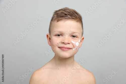 Little boy with sun protection cream on his skin against light grey background