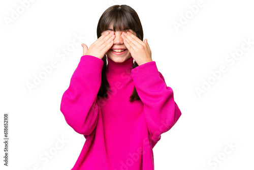 girl, people, person, female, beauty, pretty, beautiful, little, childhood, children, teenage, teenage, brunette, 1, portrait, model, caucasian, hair, background, isolated, green, chroma, cut-out, blind, close, concept, covering, dramatic, emotional, expression, eye, gesticulate, gesture, hand, hide, fun