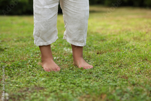 Little child standing barefoot on green grass outdoors, closeup. Enjoying nature