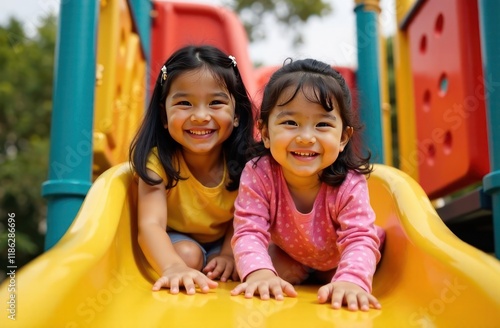 Little children at colorful playground slide, enjoying playful childhood moment, happy kids at vibrant outdoor play area - concept of playground equipment, kids' recreation, outdoor fun.