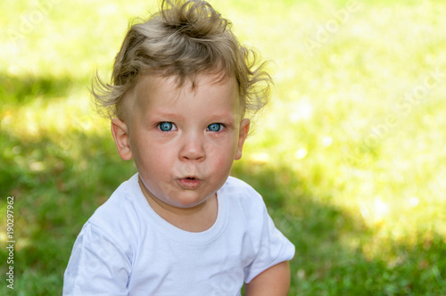 little curly boy in a white t-shirt cries in the street in the summer, closeup