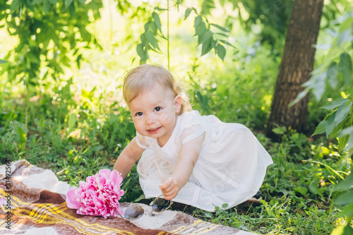 Little cute baby in a white dress with a pink peony in hands lie on a plaid in the park. Family outdoor recreation. Family summer picnic in the park. Girl outdoors surrounded by pink peonies.