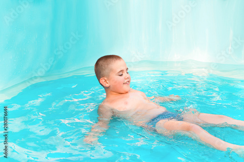 little cute boy swimming in the pool with turquoise water in the summer holidays
