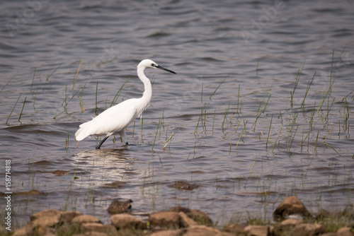 Little egret walking through shallows in lake
