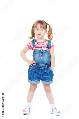people, person, girl, lifestyle, female, little, children, children, childhood, portrait, vertical, pose, posing, model, looking, expression, emotion, jumpsuit, cute, cutie, adorable, pretty, charming, beautiful, isolation, isolated, smiling, happy, happiness, preschool, schoolgirl, blond, blue-eyed, shy, denim, lovely, 1, alone, single, kindergarten, beauty, ponytail, clothing, modern, contemporary, playful, standing, innocent, healthy, casual attire