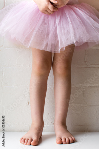 Little girl in pink tutu standing with hands clasped against white brick wall (cropped)