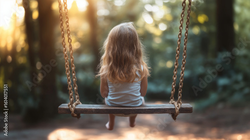 children, girl, swing, forest, wood, nature, summer, sunshine, gold, light, back, view, curly, hair, blond, wooden, metal, chain, peaceful, serene, calm, tranquil, happy, playful, childhood, innocence, rustic, natural, tree, leaf, green, blurred, background, sunbeam, warm, bright, daytime, park, playground, relaxing, sitting, young, cute, adorable, beautiful, pretty, sweet, innocent