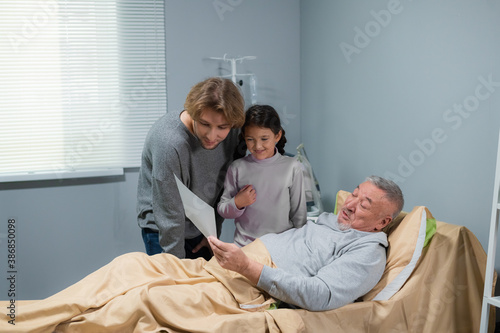 Little girl presents her sick grandfather with a drawing of hers, she came to see him in a hospital.