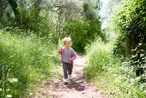 family, children, little, girl, walking, path, park, 1, caucasian, children, children, toddler, green, tree, wildflower, grass, carefree, playful, leisure, summer, holiday, happy, sunlight, fisheye