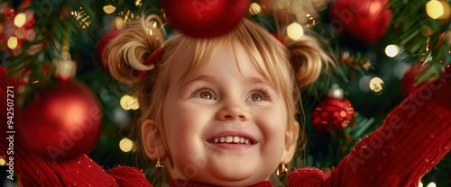 christmas, girl, children, happy, smiling, joyful, cheerful, festive, holiday, season, tree, ornament, red, decoration, light, sparkle, winter, magic, childhood, innocence, wonder, family, celebration, tradition, present, gift, santa, reindeer, snow