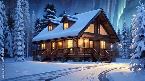 winter, snow, house, landscape, tree, village, nature, forest, scene, snowy, aurora