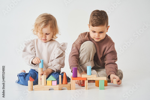 Little kids brother and sister smiling, having fun and playing colored bricks toy on white background. Children have smiling and have fun together.