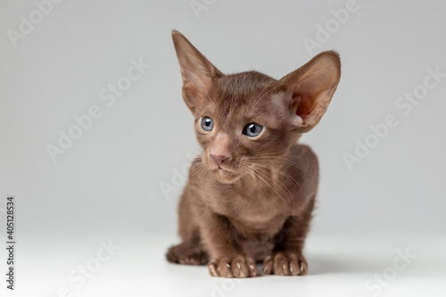Little kitten of oriental cat breed of solid chocolate brown color with blue eyes is sitting against grey background