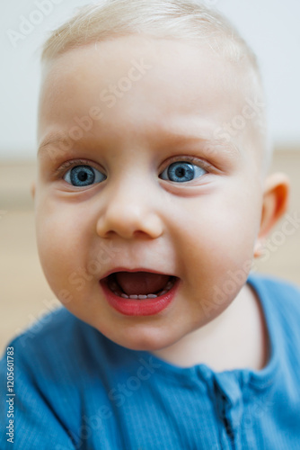 Little one-year-old boy with different emotions on his face close-up. Emotional baby. Cheerful boy. Blue-eyed toddler boy.
