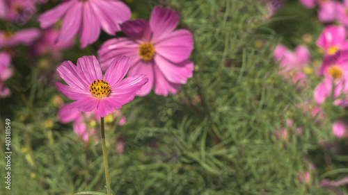 Little pink cosmos flowers with yellow pollen blooming in the garden