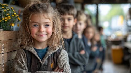 Little Smiles, Big Dreams: A line of children, led by a charming young girl with a warm smile, stand in a queue, their innocent eyes reflecting anticipation and hope.