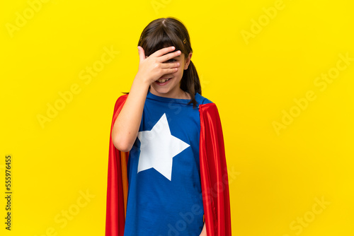 Little super hero kid isolated on purple background covering eyes by hands and smiling