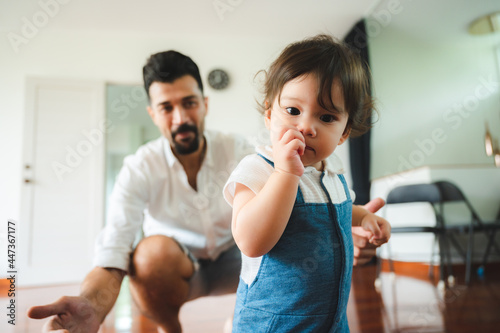 little toddler children with first walk step with stairs at home, small baby person are happy to play and learn to crawling with family, cute infant boy having fun and childhood care