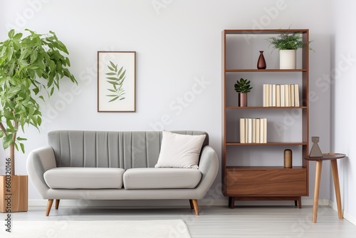 Living room interior with gray sofa with wooden cabinets and white room wall screens