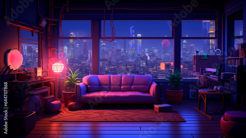 living room, neon cozy atmosphere, modern cyber punk style. Generative AI