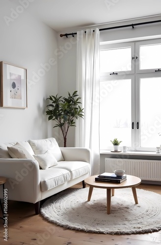 Living room with a minimalist design: white diva, wall decor and a large window overlooking a serene white landscape creating a Scandinavian-inspired look