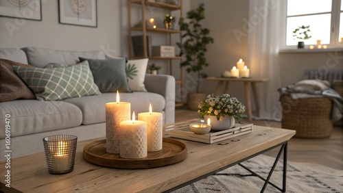 living room, candle, coffee table, sofa, pillow, cosy, atmosphere, interior, home decor, furniture, lighting, decoration, design, indoor, room, house, apartment, style, modern, relax, comfort, plant, window, shelf, wooden, tray, glasses, cushion, textile, carpet, flower, vase, table, artwork, wall, curtain, light, warm, elegant, neutral, arrangement, still life, domestic, residence, daylight