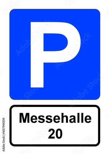 lllustration eines blauen Parkplatzschildes mit der Aufschrift "Messehalle 20"
