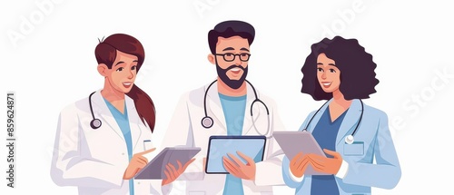 llustration of doctors in a high-tech medical lab, discussing patient data on tablets, highlighting teamwork and advanced healthcare technology.