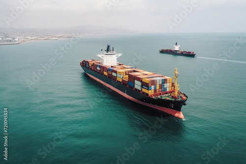 ship, container, cargo, logistic, industry, freight, export, import, transportation, shipping, transport, port, boat, tanker, harbor, river, view, sky, commerce, worldwide, ship, industrial, seafaring, ocean, loaded, maritime, nautical, vessel, sea, dusk, wave, horizon, international, trade, global, navigation, silhouette, evening, water, oceanic, speed, orange, bright, turquoise, blue, ai
