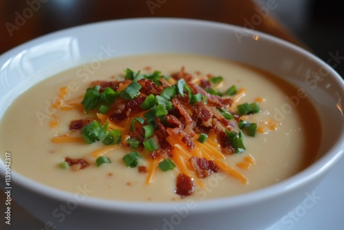 bacon, green onion, soup, creamy, comfort food, savoury, homemade, hot, bowl, hearty, dinner, lunch, garnish, closeup, warm, starchy, rustic, culinary, meal, cosy