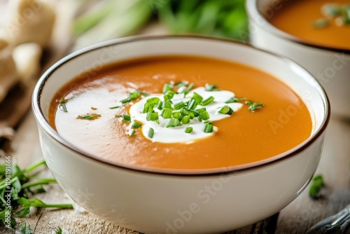 Lobster bisque served in a white porcelain bowl, garnished with a swirl of cream and fresh chives,