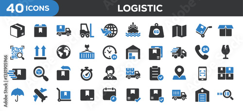 Logistic icons collection. Related delivery, shipping, warehouse. Solid colors style icons. Vector illustration isolated on white background