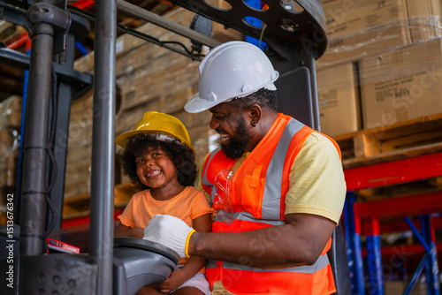 forklift, working class, employee, warehouse, delivering, work tool, occupation, working, examining, inspector, merchandise, shipping, people, industry, business, professional occupation, man, industrial building, shelf, skill, expertise, cardboard box, driving, delivery person, factory, children, daughter, walkie-talkie, embracing, female, black people, male, two people