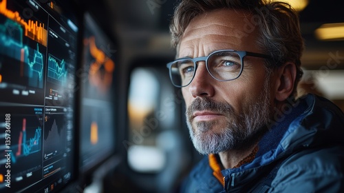 Logistics manager focuses on data analysis in warehouse environment, using advanced monitoring systems to enhance shipping efficiency and inventory management during operations.