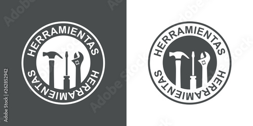 Logotipo con texto HERRAMIENTAS en círculo con herramientas en gris y blanco