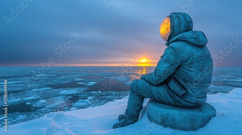 astronaut, statue, sunset, sea, ice, glacé, winter, cold, landscape, ocean, arctic, solitude, serene, peaceful, calm, horizon, sky, twilight, dusk, snow, frost, glacier, water, view, scenic, remote, lonely, figure, man, seated, light, glow, blue, orange, beautiful, majestic, stillness, calmness, discovery, exploration, travel, adventure, nature, wilderness