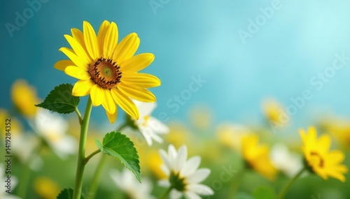 Lone bright yellow sunflower amidst white flowers, stand out, unparalleled, different