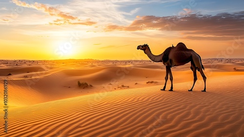Lone Camel Trekking Across Endless Desert Dunes at Sunset
