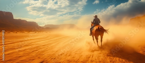 cowboy, horse, desert, dust, landscape, sky, cloud, sunlight, american, southwest, adventure, riding, western, wilderness, nature, travel, freedom, solitude, horizon, dramatic, scenery, outdoors, exploration, journey, wild, terrain, sand, arid, environment, iconic, culture, tradition, lifestyle, rural, sunset, silhouette, motion, action, huge, open, space, rugged