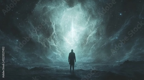Lone Figure Contemplates Celestial Nebula Awe Inspiring Cosmic Scene