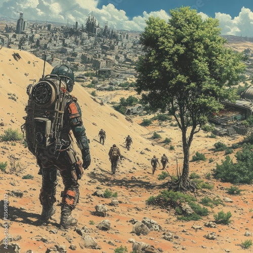desert, city, landscape, futuristic, science fiction, fantasy, adventure, journey, travel, exploration, wanderer, soldier, group, team, squad, trek, sand, dune, hill, tree, lone, figure, leading, following, sun, sky, cloud, horizon, desolate, barren, ruin, building, structure, architecture, remote, isolated, distant, far, background, foreground, artwork, digital, painting, illustration, concept, art, image