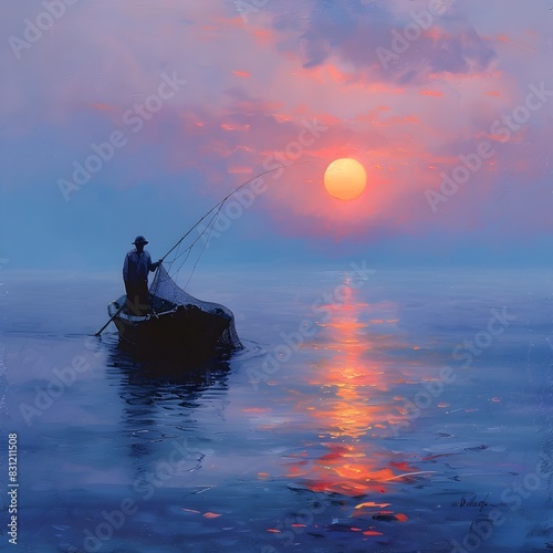 Lone Fisherman Navigating Tranquil Waters at Breathtaking Sunrise or Sunset