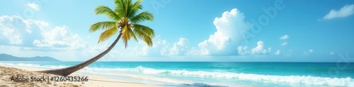 Lone palm tree leans over tranquil ocean waves, sandy beach , landscape, serene